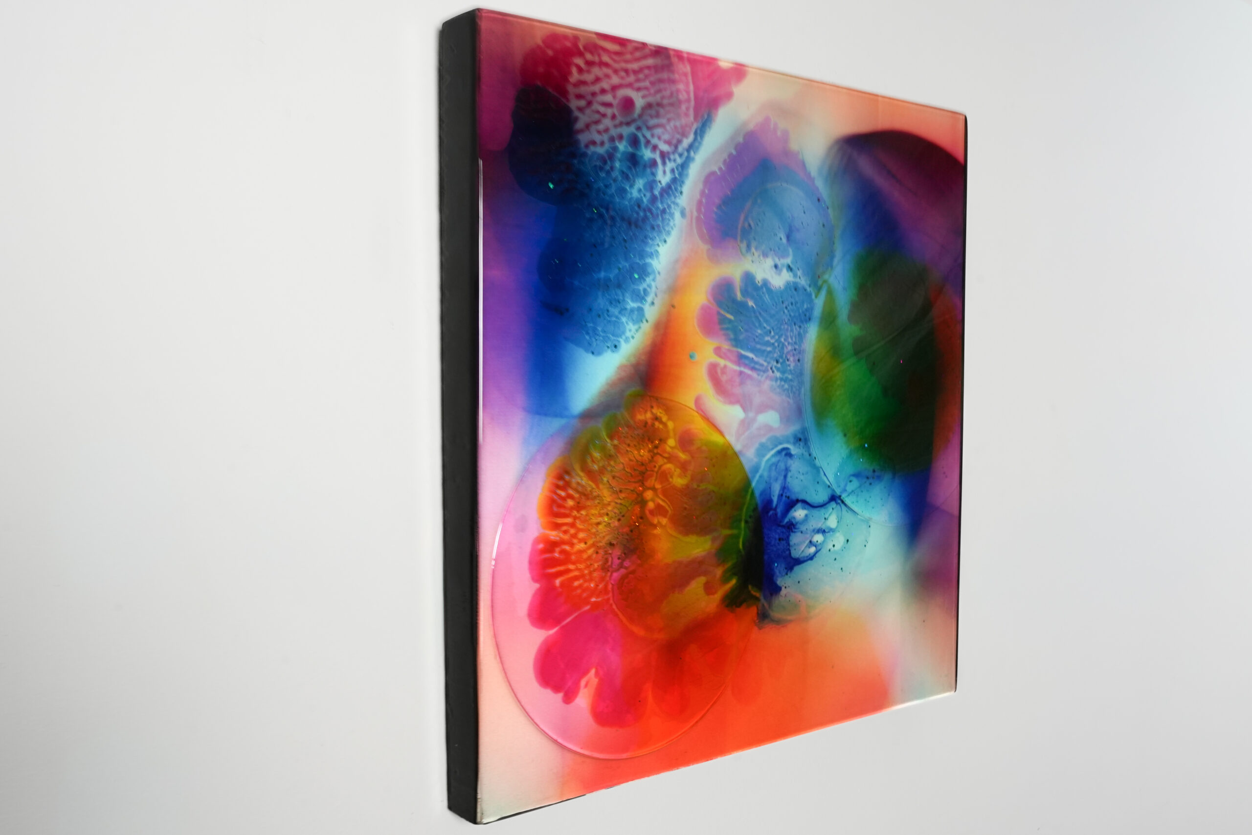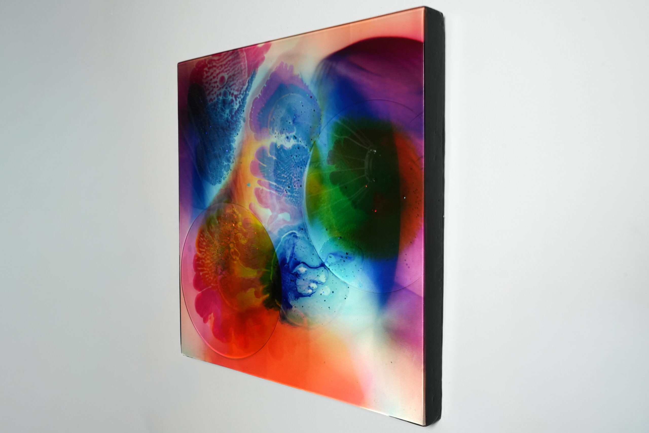Chiew combines a rich variety of pigments, dynamic forms, and refined holographic details to craft a composition full of depth, movement, and vibrancy. The use of high quality epoxy enhances the brilliance and clarity of the surface, giving the work a luminous, almost immersive finish.