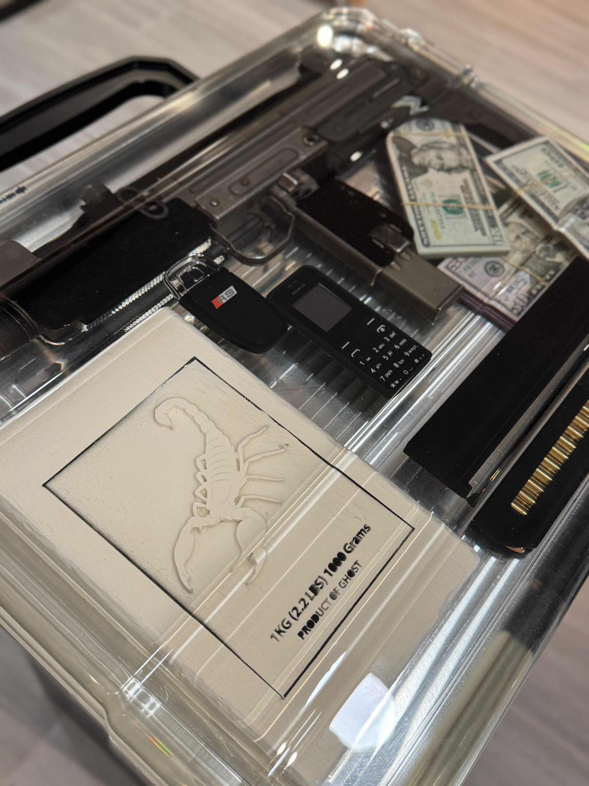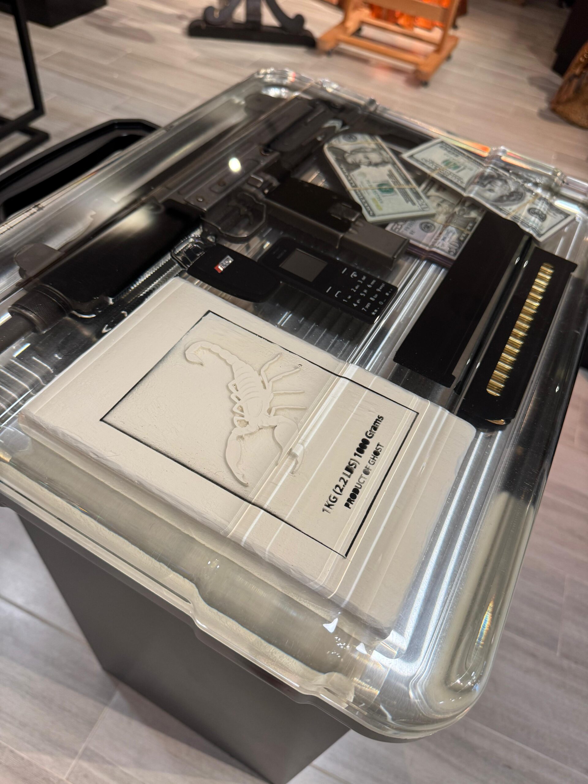 Bring a touch of bold contemporary edge to your space with Dope Boys IV, a captivating artwork that blurs the line between luxury and provocation. This one-of-a-kind piece takes the form of a sleek aluminum suitcase encasing a gun and real bullets, all preserved under a flawless layer of epoxy. By transforming objects associated with power and danger into a striking visual statement, Dope Boys IV challenges perceptions of materialism, control, and modern culture. The artwork’s polished finish and precise craftsmanship lend it a museum-quality presence, while its raw symbolism evokes reflection and conversation. Both elegant and unsettling, it captures the tension between beauty and controversy — a hallmark of avant-garde art. Perfect for collectors, galleries, and design connoisseurs seeking a statement piece with narrative depth, Dope Boys IV is more than an artwork: it’s a powerful commentary on desire, identity, and the allure of danger. A truly unique creation — only one exists worldwide.