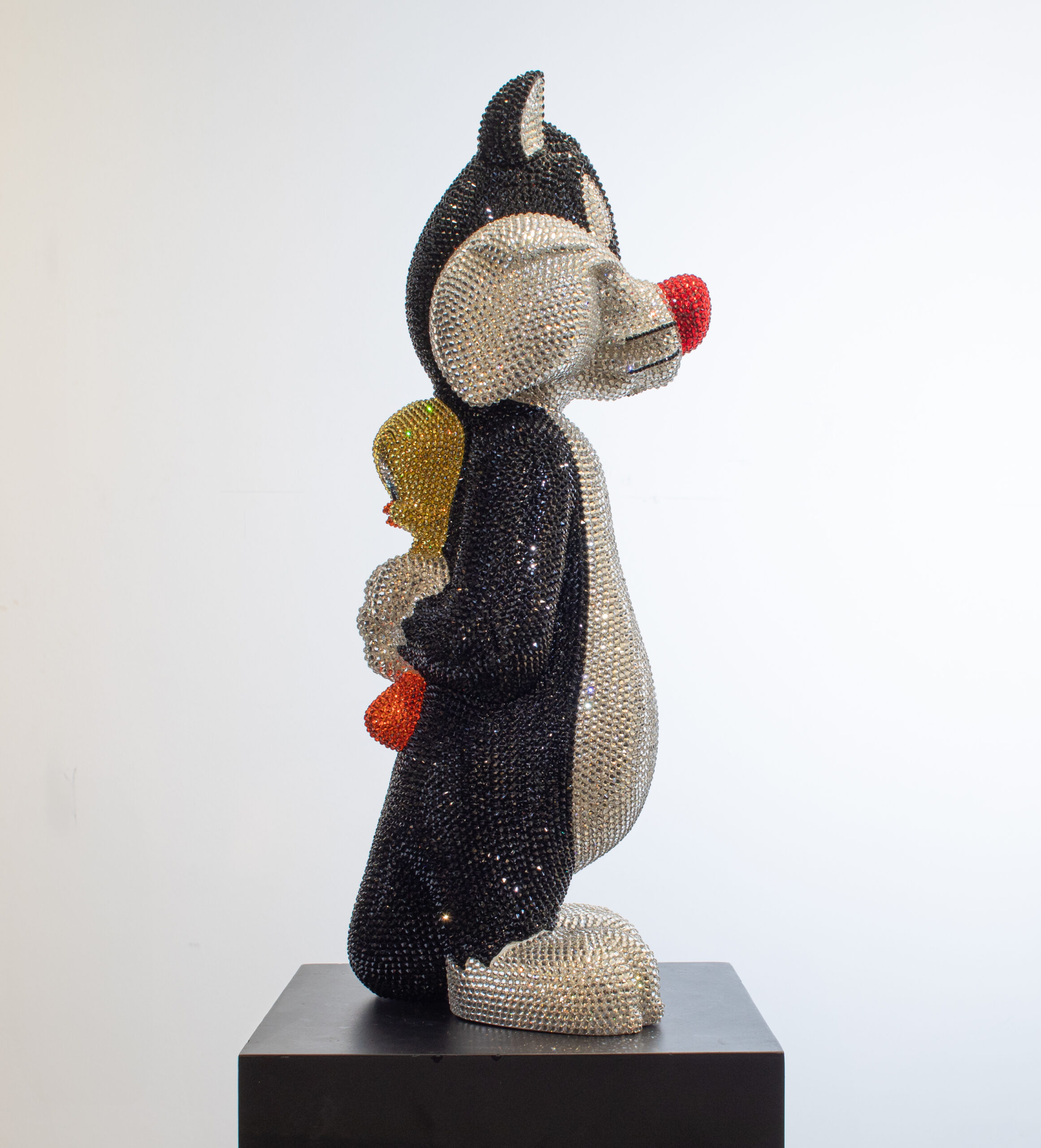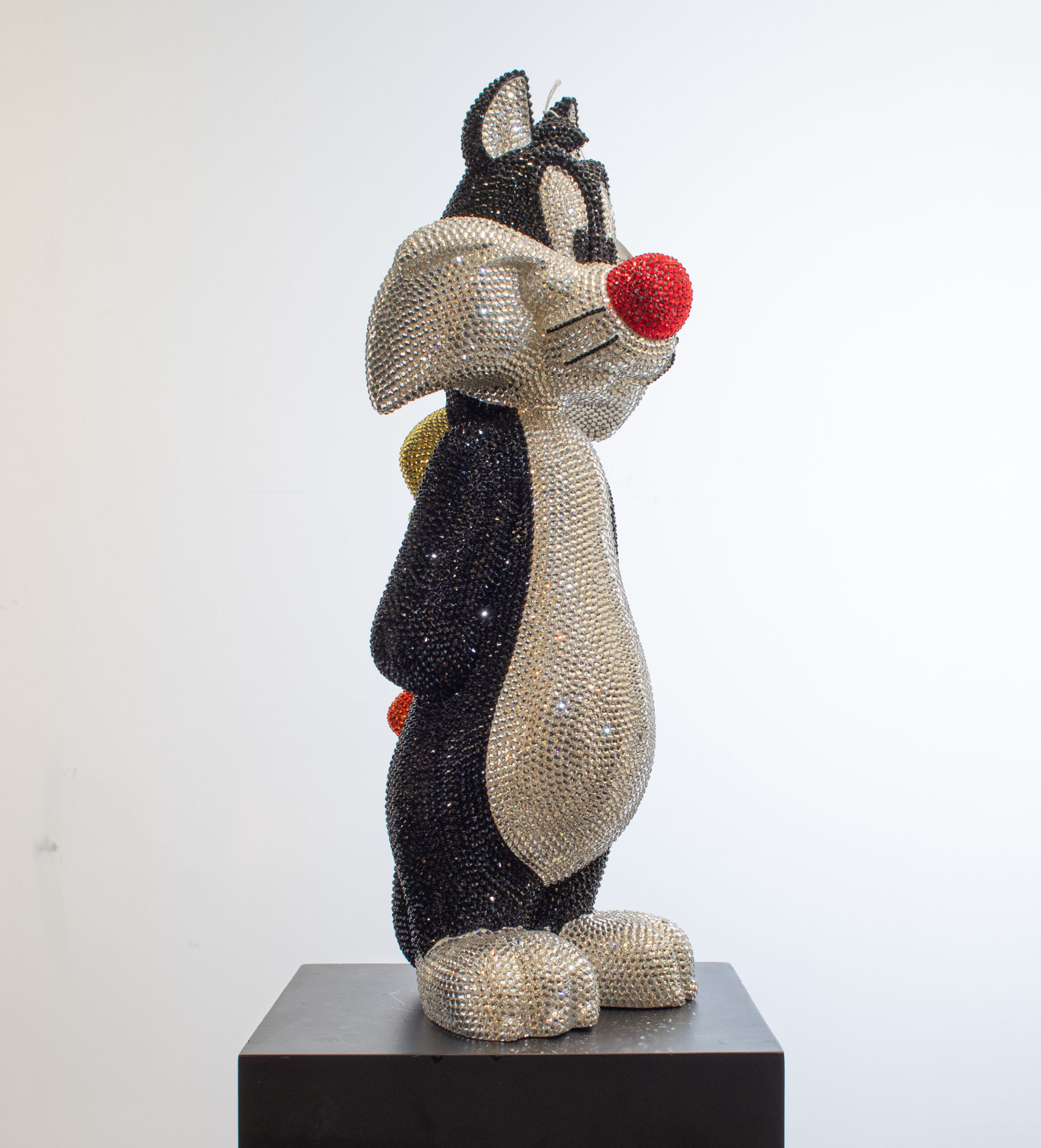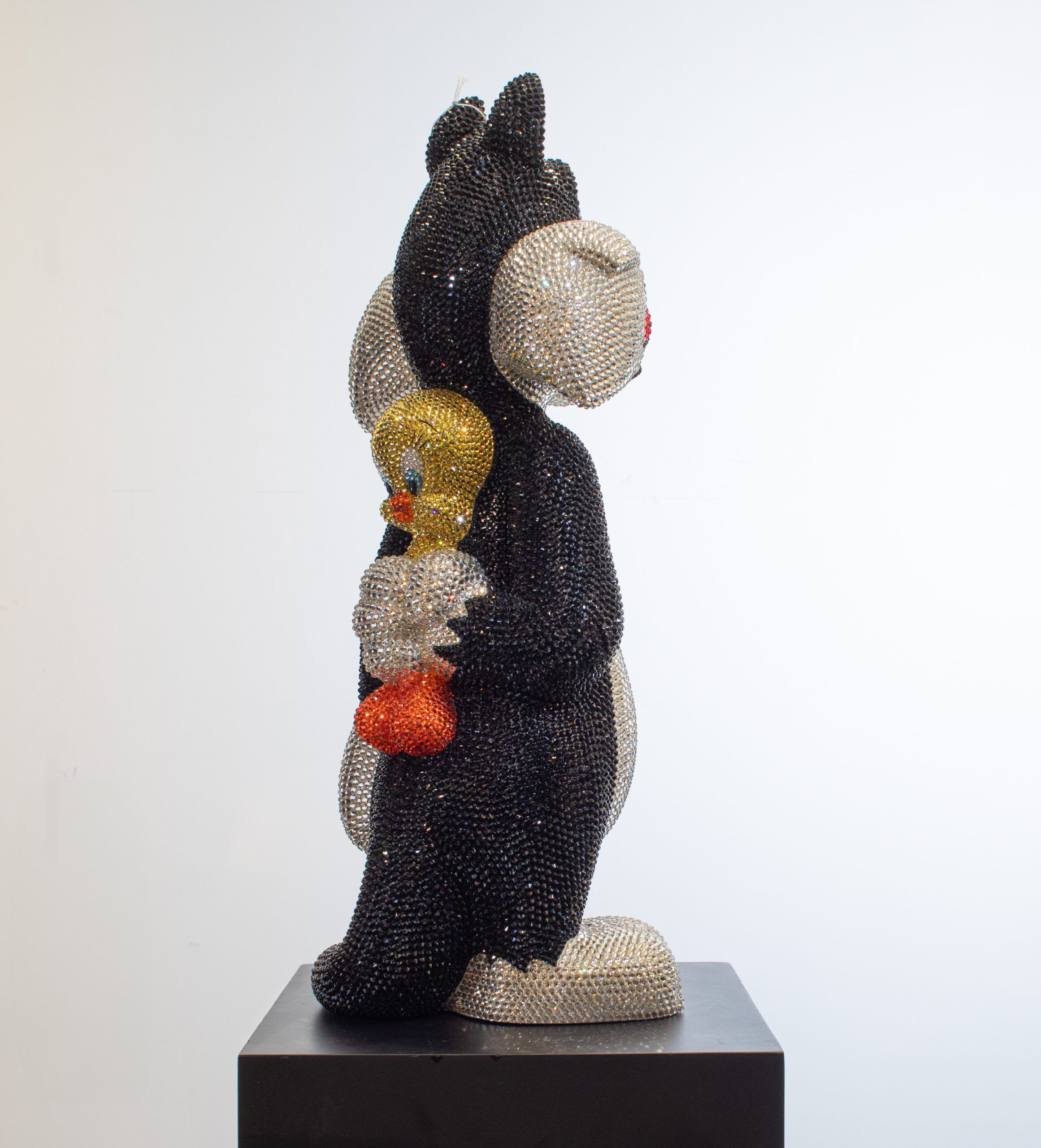 Add a touch of playful sophistication to your collection with this dazzling sculpture of Sylvester holding Tweety behind his back. Meticulously crafted and encrusted with approximately 20,000 hand-set Swarovski crystals, this one-of-a-kind artwork sparkles with luxury and charm. The shimmering surface highlights every curve and detail, transforming two beloved cartoon icons into a statement of contemporary art and design. Balancing nostalgic humor with refined craftsmanship, the piece embodies both whimsy and elegance, making it a striking centerpiece for any modern interior. Its radiant presence captures light from every angle, ensuring it draws attention and admiration whether displayed in a private collection, gallery, or luxury living space. Designed for those who value exclusivity, artistry, and a sense of wit, this sculpture is more than a playful tribute to childhood memories — it is a unique collector’s treasure, blending pop culture with high-end artistry in a truly unforgettable way.