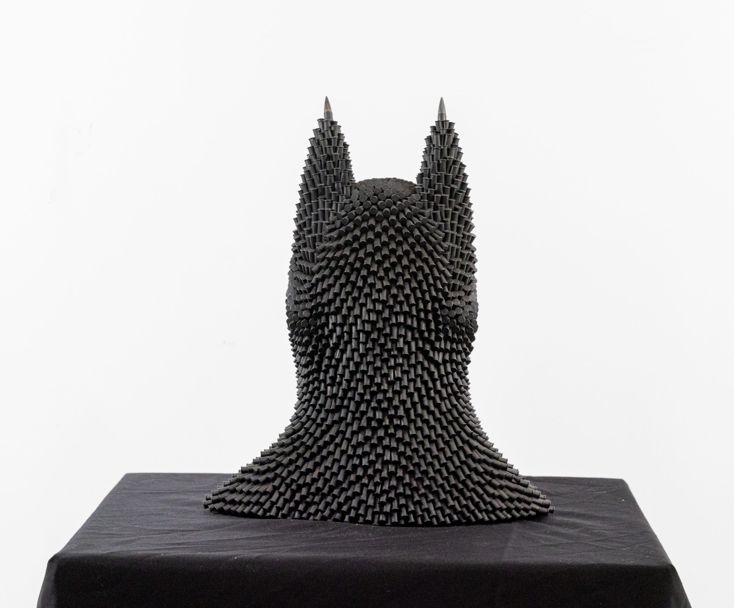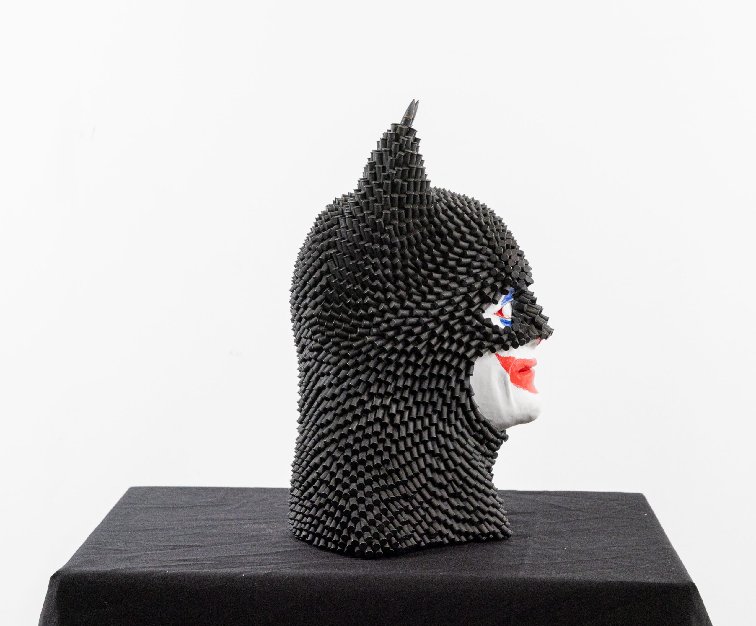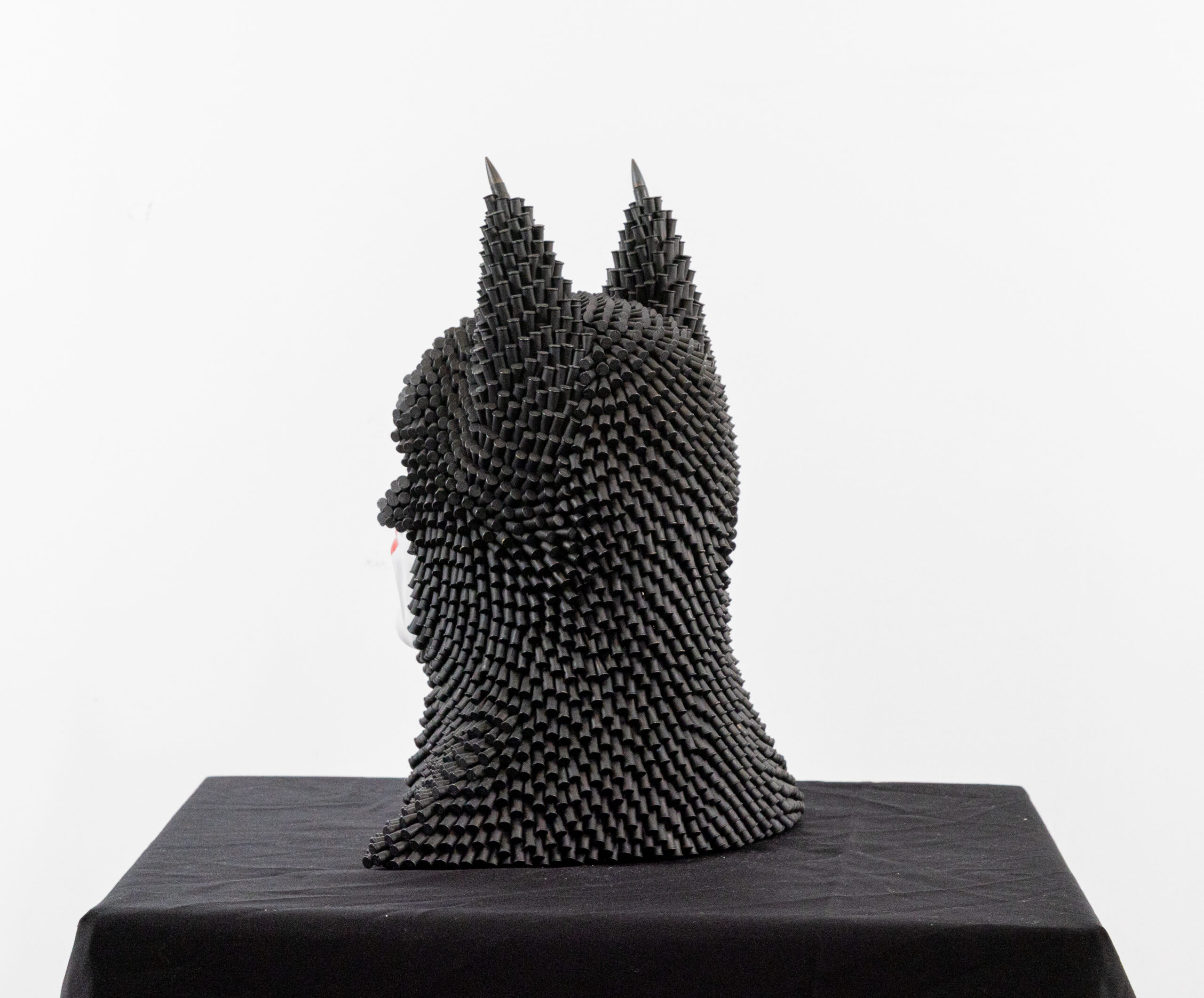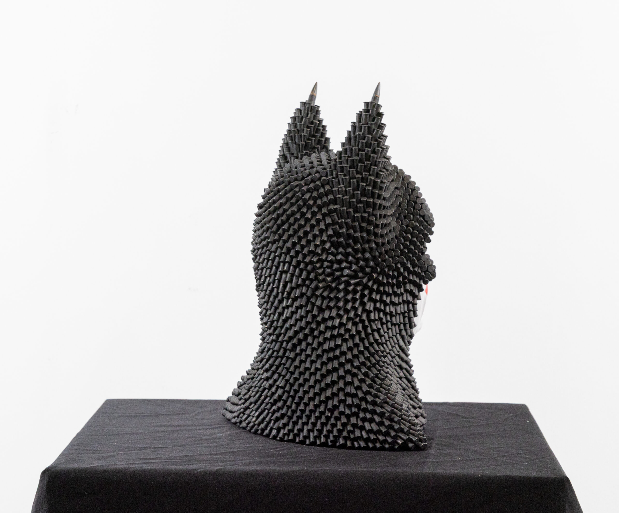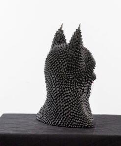Constructed from recycled bullets and hand-shaped clay, the sculpture plays with contrasts—hard versus soft, destruction versus creation. The use of reclaimed ammunition adds a raw, industrial edge, while the clay introduces human touch and fragility.